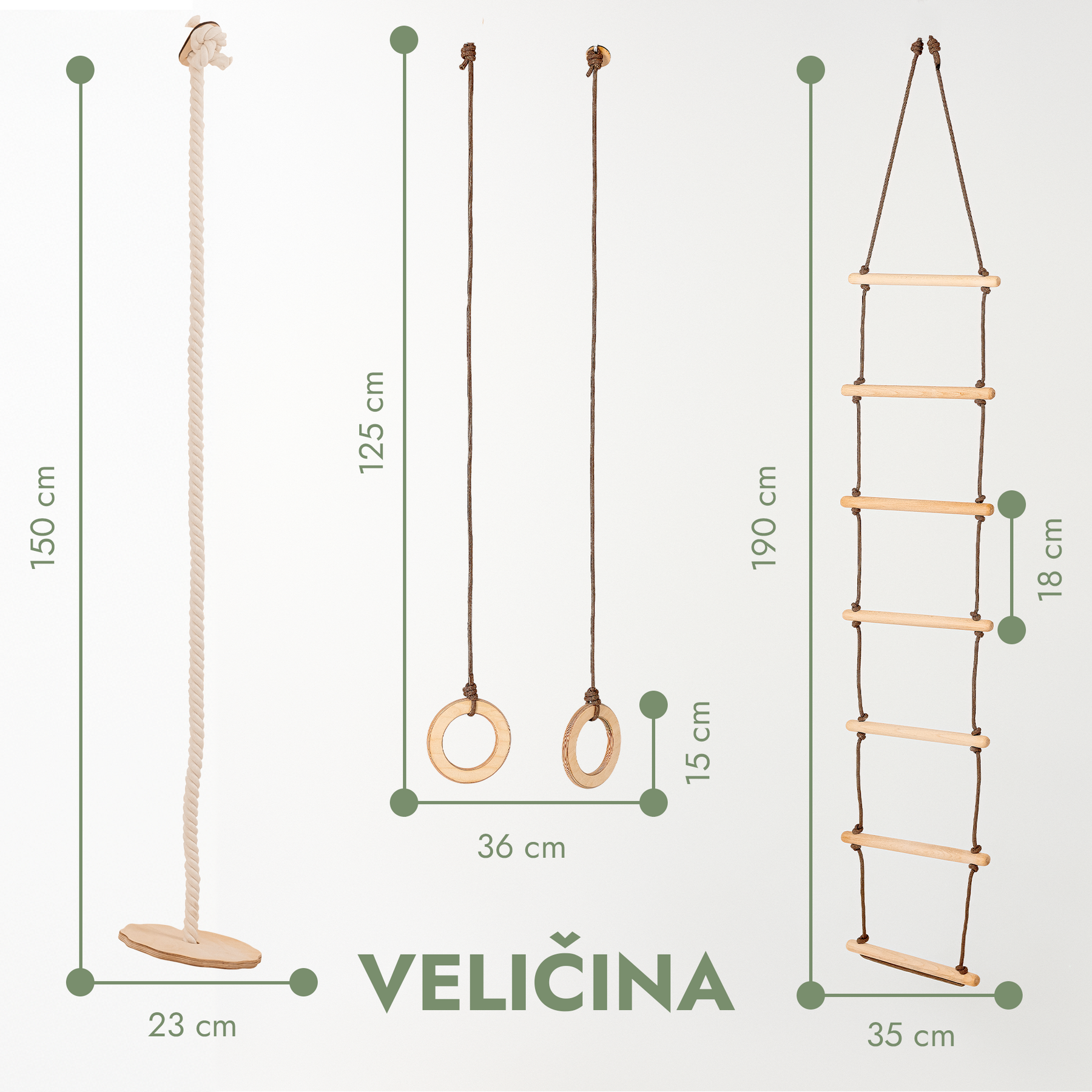 Poboljšajte tjelesni i mentalni razvoj svog djeteta našim raznolikim setom od tri ljuljačke. Savršen za unutarnje i vanjske prostore, ovaj set pruža širok spektar aktivnosti. Od ljuljanja do penjanja, potiče hrabrost, neovisnost, kontrolu ravnoteže i grube motoričke vještine. Osim koristi u tjelesnom pogledu, stimulira i mlade umove jer podučava djecu kako različiti dijelovi međusobno djeluju te ih priprema na ostvarivanje novih ciljeva.