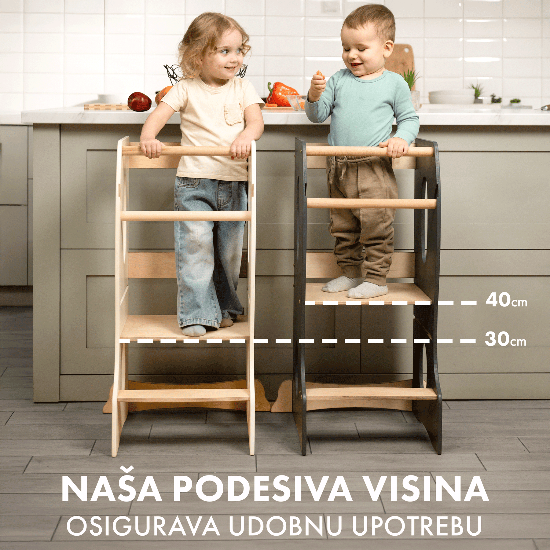 Dopustite svom mališanu da istražuje, uči i raste s pouzdanjem! Od miješenja tijesta, rezanja, točenja pa sve do pranja zubi ili posuđa — svakodnevni zadaci postaju zabavni i edukativni uz naš sklopivi toranj za učenje.