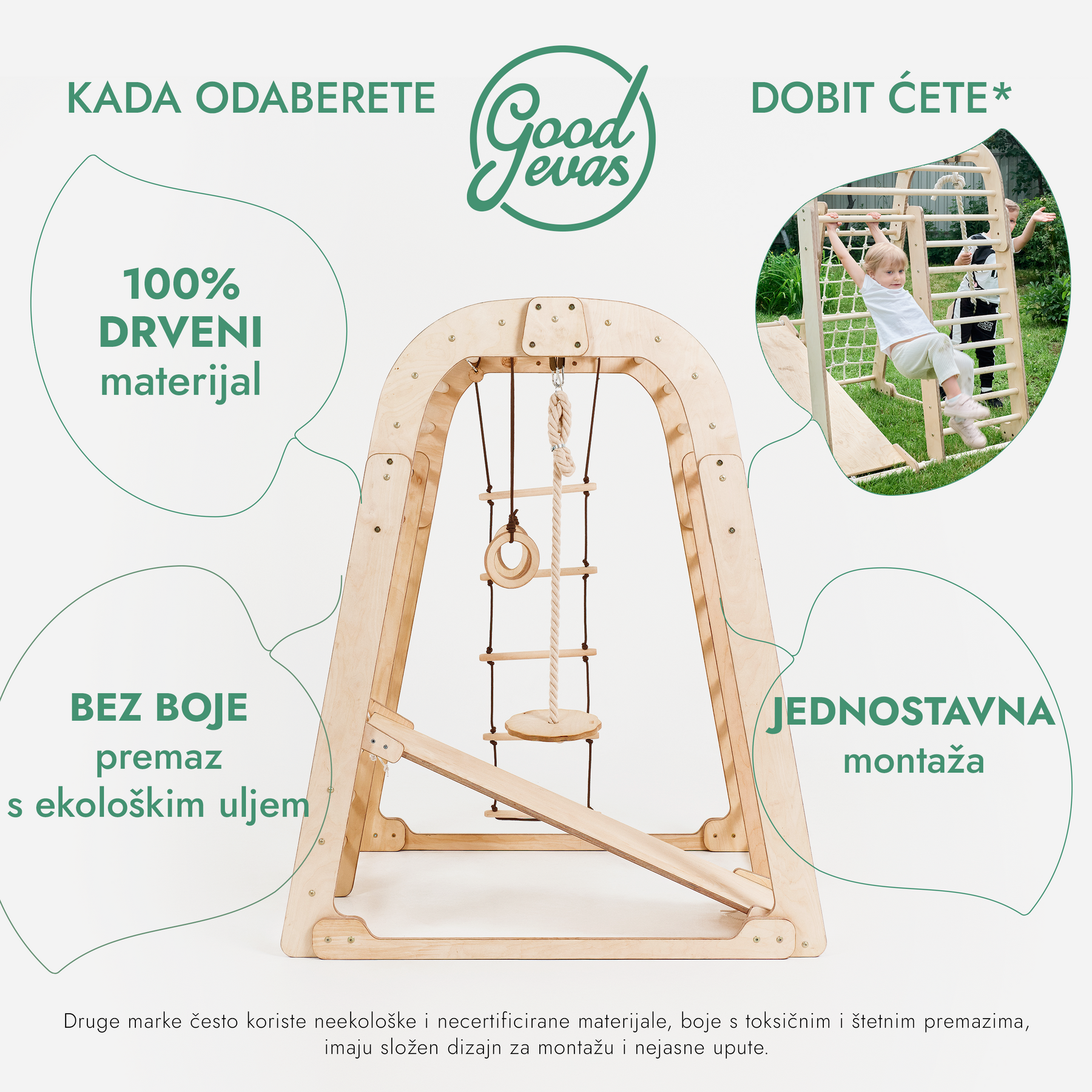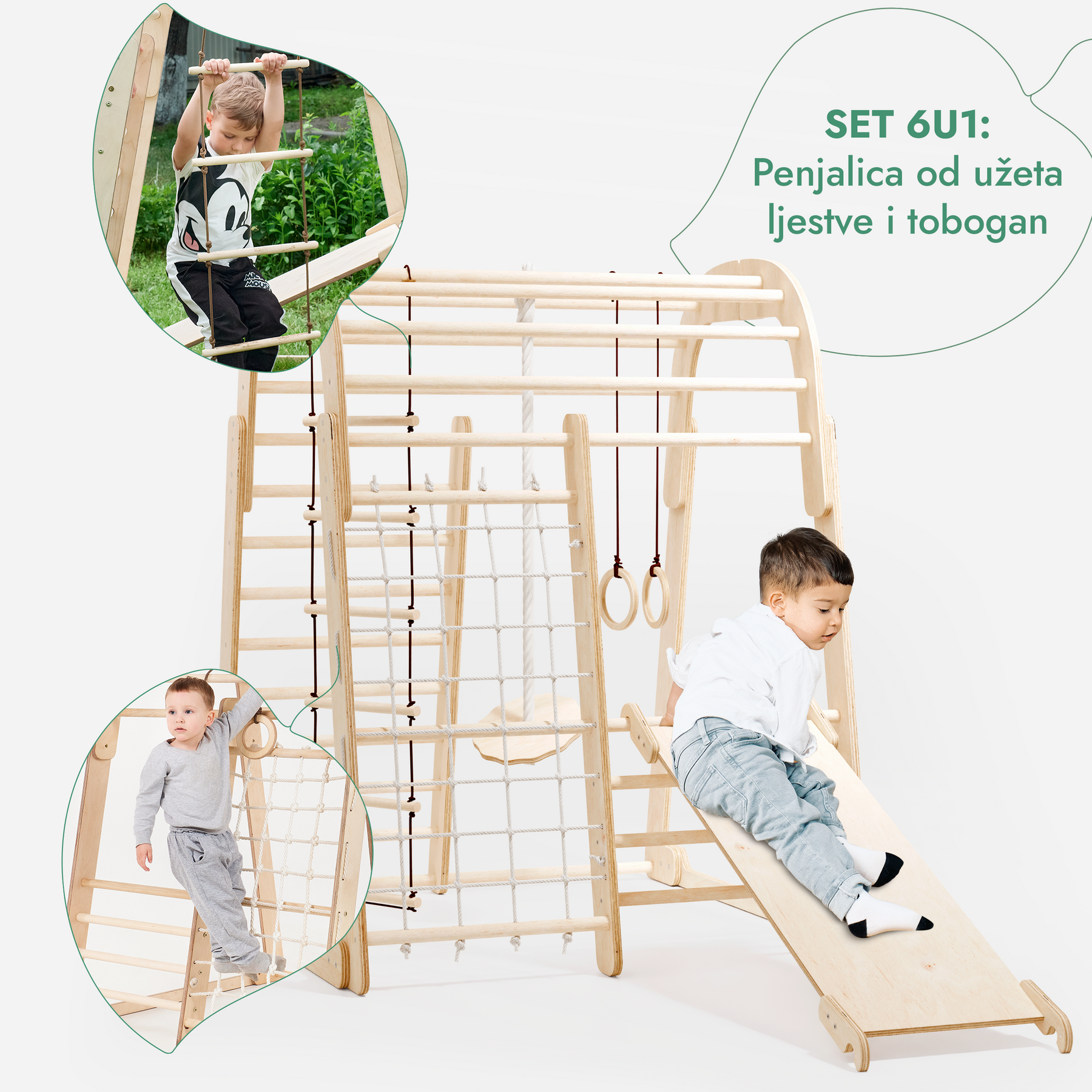 Ovaj set za igru uključuje tobogan, penjački luk, gimnastičke karike, penjačku mrežu, ljestve od užeta i švedske ljestve. Pomaže u razvoju snage, okretnosti i koordinacije te jača dječju kralježnicu. Idealan je za djecu od 1 do 7 godina, potičući aktivnu i sigurnu igru.